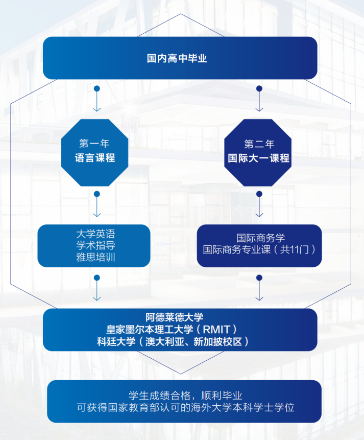 该课程运用国际化教学体系,由澳大利亚大学派遣的资深教师全英文授课,并与澳大利亚多所知名大学合作,引进国际大一课程项目。学生完成学业后,有机会入读澳洲名校阿德莱德大学、皇家墨尔本理工大学。
