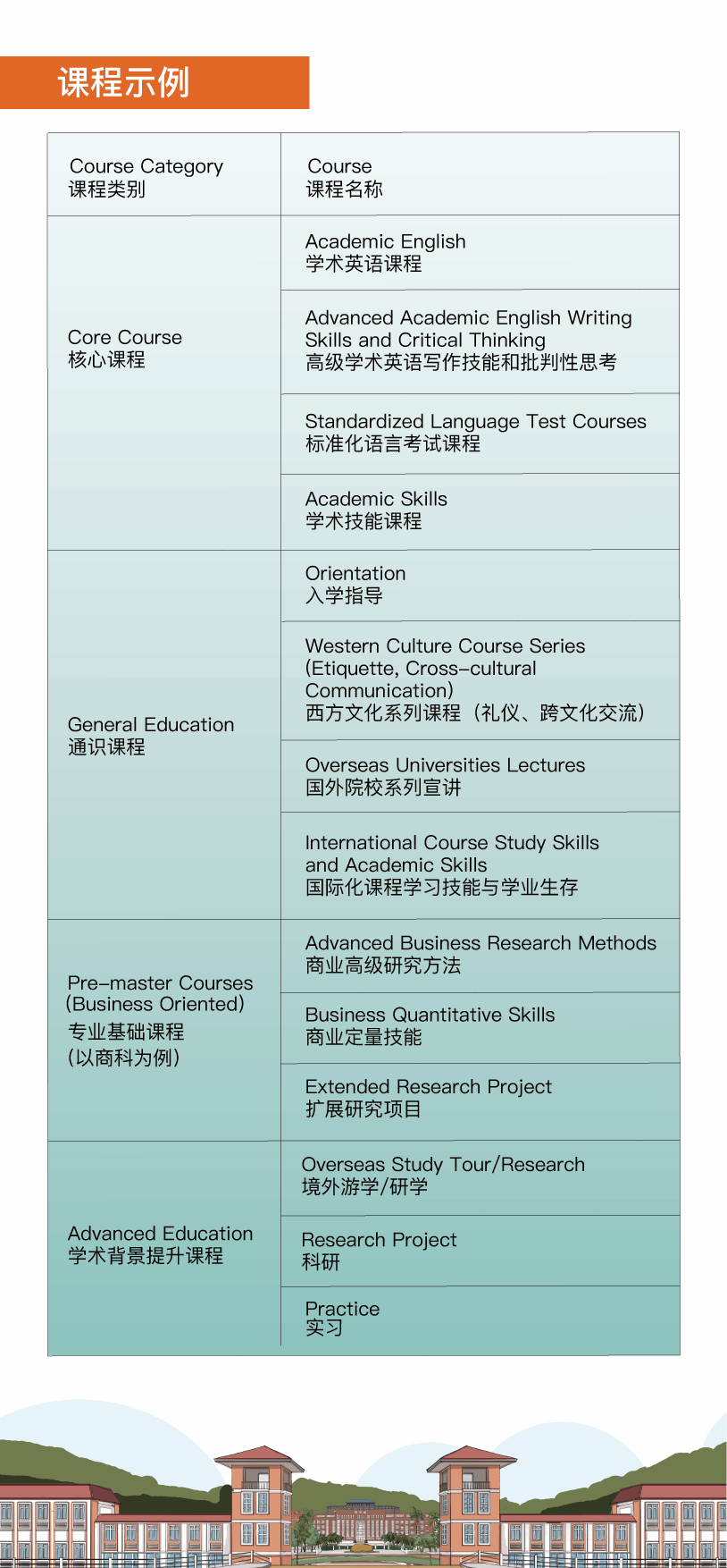 依据学生专业背景,兴趣及未来规划,设计"科学性、实用性"并重的课程,融合理论与实践,强化国际语言与专业能力,助力学生达到国际人才标准与学历提升目标。